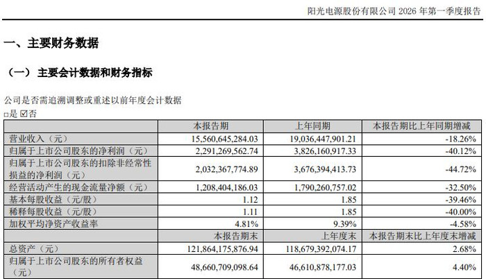 4月27日晚间,光储龙头阳光电源(SZ300274,股价131.39元,市值2724亿元)披露了2026年第一季度报告。财报显示,公司报告期内营收与净利润双双下滑。